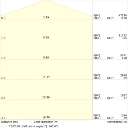 De gradenbundel geeft informatie over hoe breed het licht wordt uitgestraald. Dit zit tussen de 0 en 360 graden (D). Hoe kleiner de hoek, hoe specifieker de lichtbundel is. Over het algemeen is een smalle gradenbundel perfect voor sfeer- of accentverlichting, terwijl een brede gradenbundel ideaal is om grote oppervlaktes te verlichten.