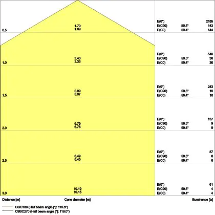 De lichtopbrengst (Lumen), geeft weer hoe krachtig het uitgestraalde licht is. Dit is belangrijk om te weten om de juiste sfeer te creëren. 0 tot 400 Lumen is bij uitstek geschikt voor accent- of sfeerverlichting. Een hoger aantal Lumen is, afhankelijk van de grootte van de ruimte, beter geschikt als ondersteunende- of basisverlichting. Heb je plafonds hoger dan 4 meter, dan is een lichtopbrengst van minimaal 8000lm aan te raden indien heldere verliching gewenst is (vb. in werkomgevingen).