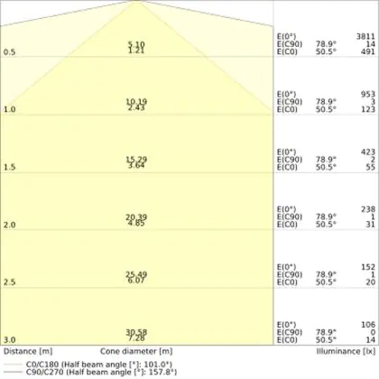 ![]() De kleurcode is een combinatie van de kleurweergave (CRI) en lichtkleur (Kelvin). Het eerste getal is de kleurweergave (1 = zeer slechte kleurweergave, 9 = maximale kleurechtheid). Het tweede en derde cijfer betreft de lichtkleur. Een lamp met kleurcode 830 heeft bijvoorbeeld een goede kleurweergave en straalt een warm wit licht uit (3000K), waar een lamp met de kleurcode 940 een uitstekende CRI heeft en een koel wit licht (4000K) uitstraalt. |